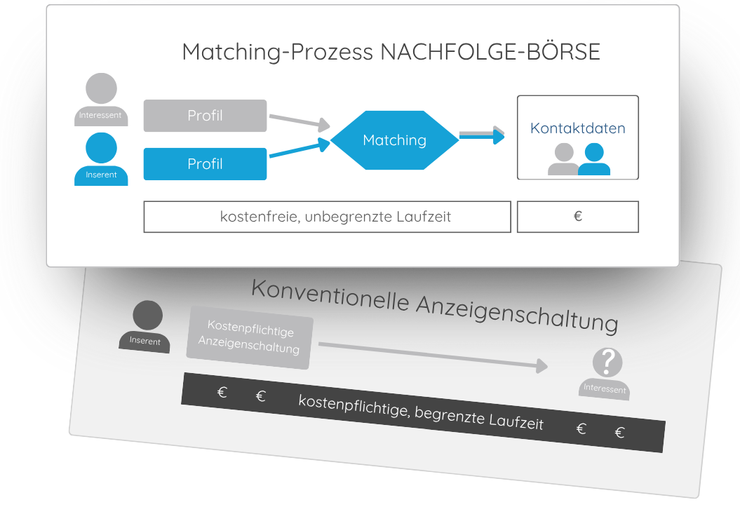 Erfolgt eine Reaktion auf Ihre Anzeige, wird Ihnen das anonymisierte Interessentenprofil übermittelt und Sie können entscheiden, ob Sie mit diesem in Verbindung treten möchten. Im Gegensatz zu klassischen Stellenanzeigen gibt es auf der NACHFOLGE-BÖRSE keine sich durch die Laufzeit einer Annonce anhäufenden Kosten.