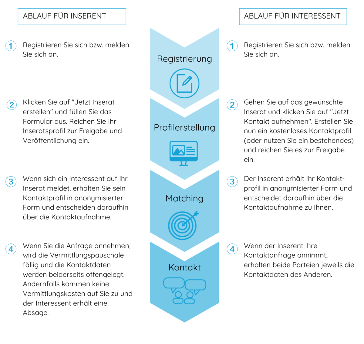 Die Kontaktvermittlung über die NACHFOLGE-BÖRSE verfolgt einen erfolgsorientierten Ansatz. Daraus ergibt sich ein etwas anderer Ablauf als auf konventionellen Anzeigenplattformen.